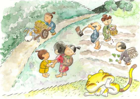 それからというものは、野菜の収穫、ひえの収穫、キビの収穫が出来る度に、テツは山へ、海へ使いに行きます、テツが使いに来ると、山の人達は肉と野菜を交換に来ます、海の人が魚と交換に来ます、時には、山の人と海の人とも交換をする様になり、山の人も、海の人も、テツが使いに来るのを待つようになり、「猫が招きに来るのはまだか」、猫が招きに来て呉れると、山の村も海の村も、みんながおいしいものが食べられると云う事でお祭り気分で、楽しみにする様になりました。