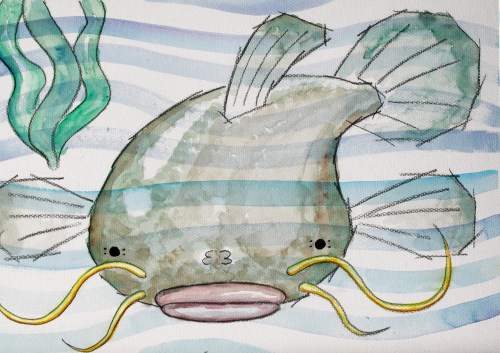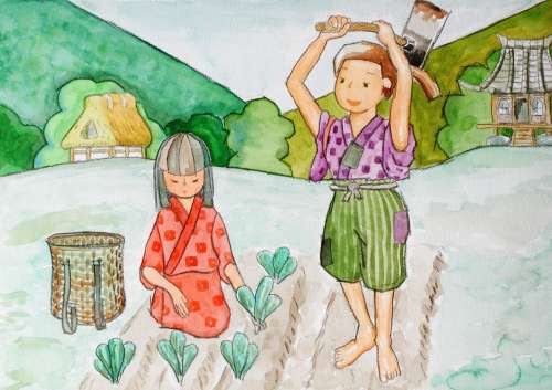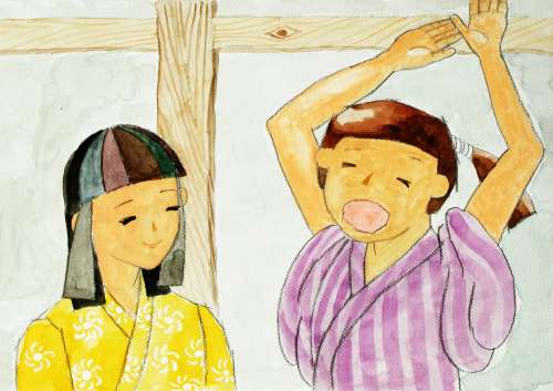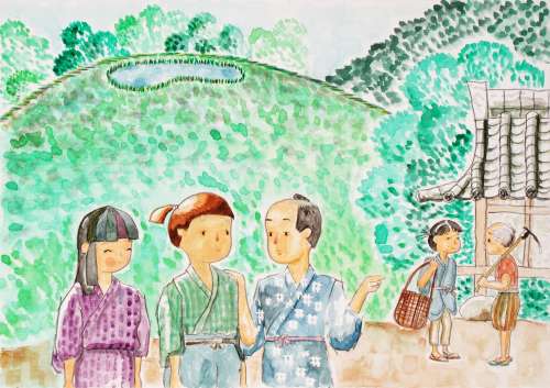 ![]() はじまり、 はじまり、 ![]() 昔々、筒井村の西の外れ、今のかすがの坂のあたりに竹次郎ともえという仲の良い夫婦が住んでいました。 二人は働き者で、もえは何より心の優しい女房でした。 困っている人を見るとほっておくことができません。 そのために家は大変な貧乏でした。 それでも二人はせっせと働くのでした。 ![]() この二人の家の隣に銀蔵と言う男が住んでいました。 銀蔵はケチな上たいそうな意地悪で村の嫌われ者でした。 ある日、その銀蔵の家の前に、身なりの貧しい老人が今にも死にそうな様子で倒れていました。 髪はボサボサ、着物もボロボロでしたが、ひげだけは長く立派な老人でした。 銀蔵は 「やっかいな奴が現れた。」 と思いました。 「飯を一杯めぐんで、くれ。」 と言う老人に向かって 「他人様に食わせるような飯はねえ。」 とだけ言うと、ピシャと戸を閉めて家の中に入ってしまったのです。 ![]() そこへ畑仕事から帰ってきたもえが通りかかりました。 かわいそうに思ったもえは、家に入れてやり、なけなしの飯を喜んで出してあげました。 老人は、 「うまい、うまい」 と言って食べ、お礼に長い立派なひげを一本くれました。 そして 「何かとても困ったときに、これを池に浮かべて、願をかけるがよい。」 と言って山へと去っていきました。 ![]() もえと竹次郎は、またせっせと働く毎日に戻りました。 ―――ところが、あんなに元気者だった竹次郎が夏の始めころからふさぎこむようになりました。 畑しごとも辛そうになり、ある日ふとんから起き上がることもできなくなってしまいました。 ![]() 竹次郎はもえの献身的な看病にもかかわらず日毎に悪くなるばかりで、とうとう明日をも知れぬ身となってしまいました。 頭をかかえたもえは、いつかの老人の言葉と、あの長い立派な一本のひげのことを思い出しました。 もえは、さっそくどこの池に浮かべたらよいか考えました。 そして思い当たったのが籠池でした。 ![]() 籠池はかすがの坂をずっと北に上っていった突き当たりにありました。 今も籠池通という通の名として残っています。 なぜ籠池というかいうと、籠は目が粗くて、水を貯めることができないように、この池は漏水が多かったそうです。 しかしその籠池には龍神様が住んでいるとうわさされていたのです。 なぜならこの池は風も無いのに大きな波が立ったり、深夜にドボンという音がするので村の人たちはそれを龍神様のせいだと考え、籠池には龍が住んでいると思ったのです。 ![]() だから、もえは 「ひげを浮かべるのはこの池しかない!」 と思ったのです。 でもこんな漏水の多くて少ししか水のない籠池に龍神様が住んでいるはずはありません。 実はこの池に住んでいるのは"ナマズ"だっだのです。 昔からナマズが動くと地震が起こると言われているように、ナマズは一人では寂しいので、村人に忘れられないように、ひげを動かして、たまに水面を波立たせてみたり大きな音を立ててみたりしていたのです。 そしてそれを見た村人たちが龍神様がいると噂しているのが嬉しくて、たまにはお供え物ぐらい持って来ないかな、と期待している気のいいナマズなのでした。 ![]() もえは、老人に言われたとおり一本の長い立派なひげを籠池の水面に浮かばせて、竹次郎の病気が早く治りますようにと、心を込めてお祈りしました。 するとどうでしょう、水面に浮かんでいた長いひげは、まるで水中から何かが引っ張ったかのように沈んでいったのでした。 それを見たもえは龍神様だと思い、嬉しくなって急いで竹次郎のもとへと飛んで帰りました。 実は池の中にいたナマズが浮かんでいるひげを不思議に思い、 少し引っ張ってみたのです。 するとその瞬間、一本の長い立派なひげは突然きらきらと眩しく輝いて消えてしまったのです。 ナマズはただただ驚くばかりでした。 ![]() もえが家につくと、思った通り竹次郎は元気な姿に戻っていました。 もえは龍神様のおかげだと思い、 ひげを持って籠池にお祈りに行ったことを話しました。 ![]() さっそく二人は、籠池の龍神様にお供えを持ってお礼を言いに行きました。 何も知らないナマズはびっくりするのですが、 久しぶりのお供えに気分良く喜ぶ気のいいナマズでした。 ![]() 不思議なことに竹次郎が直ったとたん、 今度は隣の銀蔵が原因不明の病にかかり、大変苦しんでいるというのです。 それを知った二人は、龍神様にお願いしようと、 再び籠池へと向かいました。 ![]() 「龍神様、先日はおらの願いを聞いて下さって本当にありがとうございました。 今度は隣の家の銀蔵が病気にかかって苦しんでおるんじゃ。 どうかもう一度あのひげ・・ひげを下さらんかね。」 ともえは、必死の思いで池に向かってお願いしました。 池の底で聞いていたナマズはあせってしまいました。 そしてあの不思議なひげを思い出しました。 「そうか、あのひげは龍神様のひげだったのか。」 でも貰ったお供えはもう食